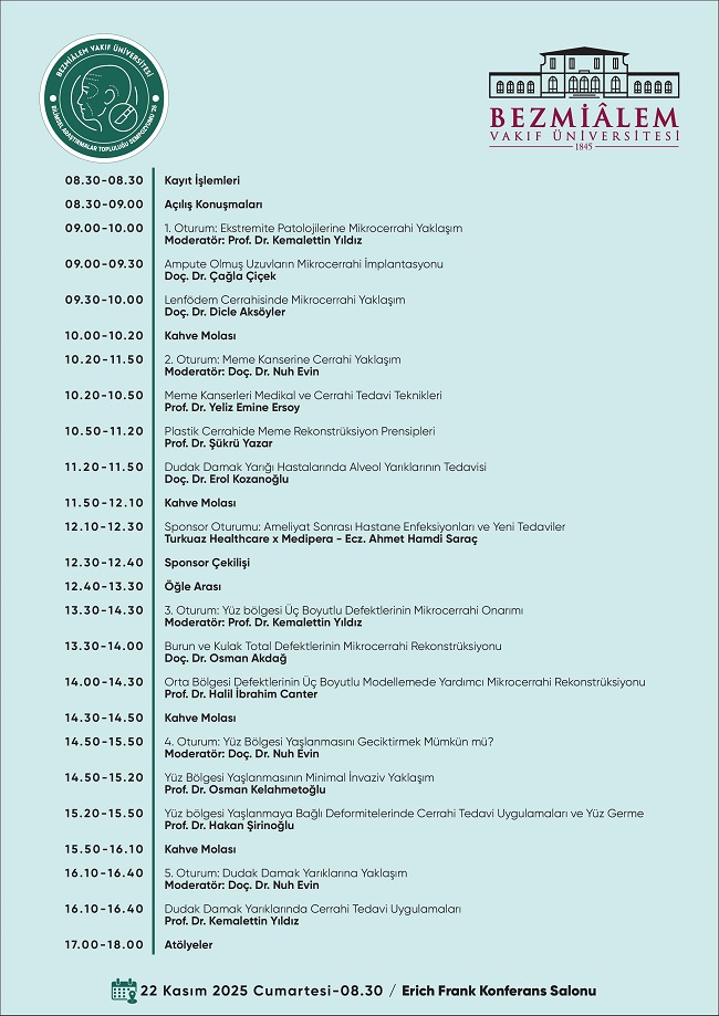 Bezmialem Vakıf Üniversitesi bünyesinde dördüncüsü düzenlenecek olan Bilimsel Araştırmalar Topluluğu Sempozyumu'25 ekibi olarak amacımız Plastik Cerrahi ve Mikrocerrahi alanlarına ilgi duyan tıp fakültesi öğrencilerini alanında uzman hekimlerle buluştırmak ve hem öğrenim hemde meslek hayatlarına bir iz bırakmaktır. Bu değerli buluşma sayesinde öğrenciler, güncel cerrahi teknikler, en son gelişmeler ve yenilikçi tedaviler hakkında doğrudan bilgi edinme fırsatı yakalayacaklardır. Etkinliğimiz, multidisipliner bir perspektifle gerçekleştirilecek oturumlarla, geleceğin doktorlarının Rekonstrüktif ve Estetik Cerrahideki en güncel yaklaşımlar ile Mikrocerrahi Replantasyonlar hakkında meslek hayatlarında kalıcı olarak kullanabilecekleri yetkinlikler kazanmalarını amaçlamaktadır. Sempozyumumuz, güncel bilimsel içeriği her düzeyden tıp fakültesi öğrencisinin kolaylıkla anlayabileceği, yalın ve ilham verici bir anlatımla aktarmayı hedeflemektedir. Geleceğin hekim adaylarına ışık tutmak amacıyla düzenlenen bu etkinlik, aynı zamanda ülkenin bilimsel ve teknolojik araştırma gücünü yükseltmeyi, nitelikli bilim insanları yetiştirmeyi ve tıp dünyasına yeni yetenekler kazandırmayı hedefler. Oluşturulan bu yüksek etkileşim ortamıyla, sempozyumda sunulacak nitelikli akademik oturumların ve yeni araştırmaların bilim dünyasına somut ve olumlu katkılar sağlaması amaçlanmaktadır.